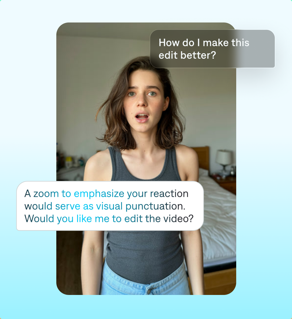 For most platforms, you start by uploading a video or recording one within the app. Then, you open the chat-based editor and tell the AI what you need, like prompting ChatGPT or Gemini. This can be a direct command or a question—however you like to type. After each request, the AI works to apply your edit. Continue refining your project until you’re satisfied, then export it and start sharing.